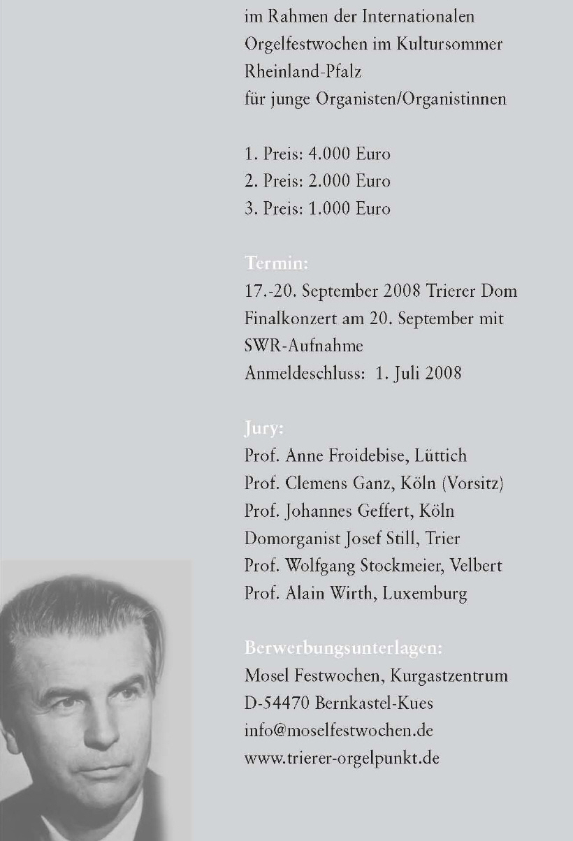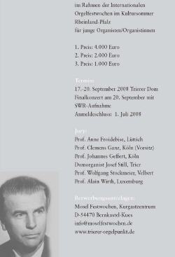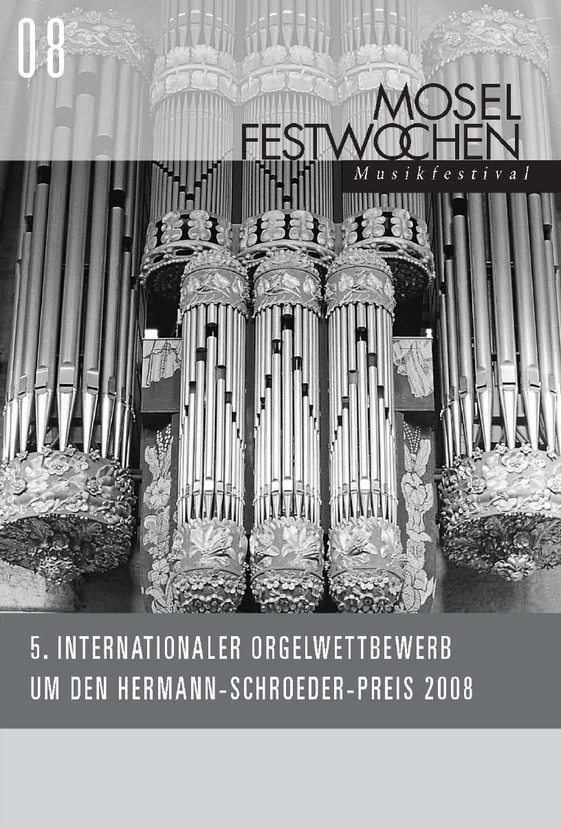 Der 5. Internationale Orgelwettbewerb um den Hermann-Schroeder-Preis fand vom 17. bis 20. September 2008 in Trier statt. Ausschreibungsbedingungen und Pflichtstücke finden Sie als pdf-Dokument hier [21 KB]