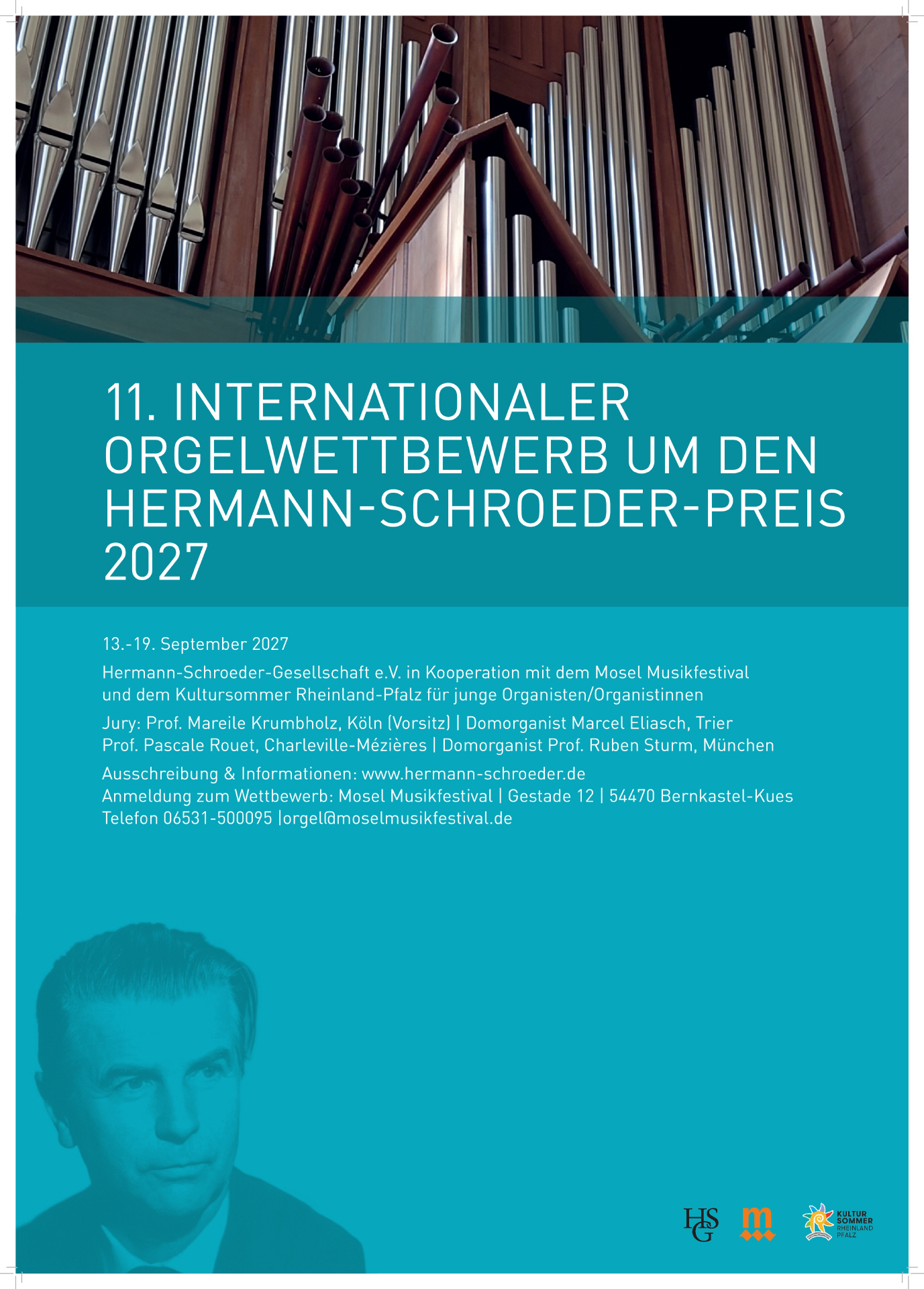Vom 13. bis 19. September 2027 findet der 11. Internationale Orgelwettbewerb um den Hermann-Schroeder-Preis 2027 statt. Austragungsort ist die Abtei Himmerod (Eifel). Zugelassen sind junge Organistinnen und Organisten bis zur Vollendung des 30. Lebensjahres (Stichtag 30.12.2026). Der Wettbewerb besteht aus einem 1. Durchgang (Videoeinsendung), einem 2. Durchgang im Kloster Himmerod (16.9.2027) sowie einem öffentlichen Finalkonzert am 19.9.2027.